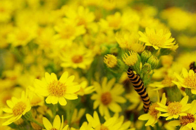 Reliable sources say that there are 30 species of invertebrates that are wholly dependent on ragwort. The cinnabar moth (Tyria jacobaeae) is the best known and most recognisable of these. It lays its eggs exclusively on ragwort and its caterpillars eat the leaves down to their stalks before moving onto the next plant. They absorb toxic alkaloids from their diet, a fact they advertise with black and yellow stripes to warn predators.