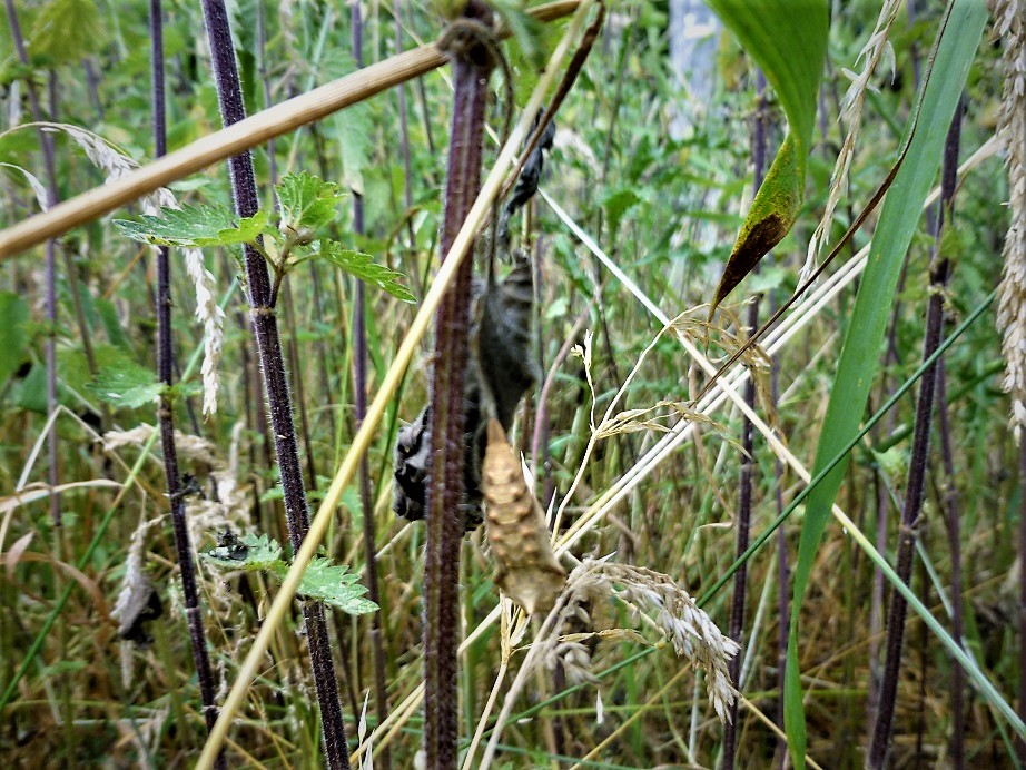 ‘When walking back from the work party last Wednesday we had a look at the nettle patch in Simpsons where there had been several Peacock nests. Today I had another look and found a chrysalis – rather beautiful.’