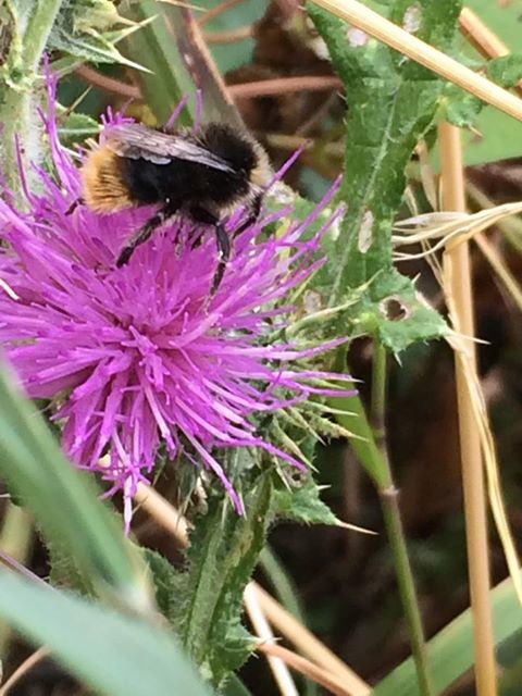 At this stage of the summer, the bumblebee’s colours are fading and his yellow thoracic bands and moustache look grey in these pictures. He mated with newly hatched queens earlier in the summer so essentially his job is done and he will die in the autumn. He does no work in the nest. The female workers raise and feed the next generation; the male feeds only himself.