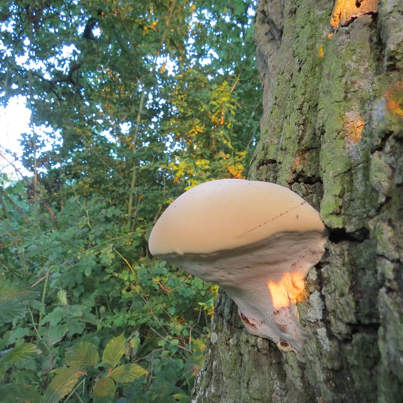This fungus belongs, we think, in the genus Ganoderma. We were waiting for it to mature so that we could identify the species properly; as it aged, the top began to go brown and the edges to lift. Last year, somebody knocked the bracket off the tree before it reached the identifiable stage – and it happened again this year.