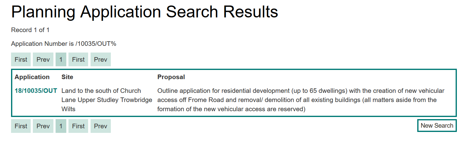 RPS, acting for a named client, has submitted an outline planning application for the Church Lane site. The Wiltshire Council reference number for the application is 18/10035/OUT. This morning, searching with this reference produced this result: