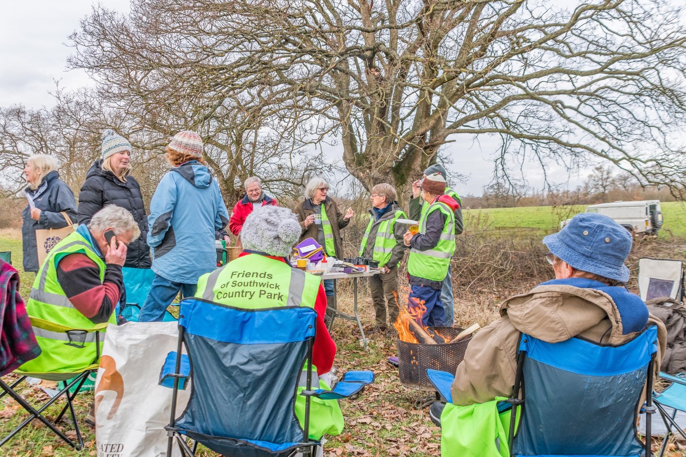As this was our last working day for 2018, we broke up early to have our annual Christmas eateries, some liquid refreshments and a chit-chat around a welcome log fire (contained in an oldย washing machine drum). We were also joined today by Councillor Horace Prickett, our Chairperson Joan, Treasurer Pat, and Vicky & Richard (Countryside Team members) along with their new arrival, Isla.