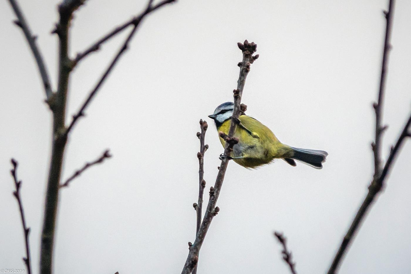 Most birds can’t create pigments, other than melanin, on their own. This bluetit, high in the park’s canopy, can’t produce the pigment, carotene, that makes his tummy yellow; it comes from pigments in the green caterpillars he eats. The more caterpillars he eats and the brighter his tummy, the more likely he is to attract a mate.
