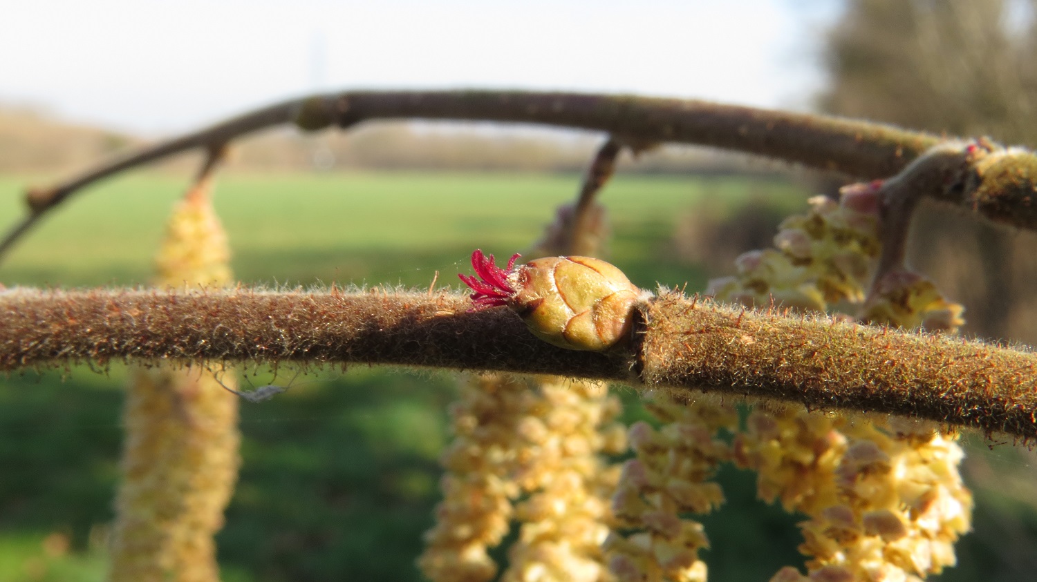 Hazel has both male and female flowers. The familiar yellow catkins are made up of about 250 male flowers. They produce the pollen; if you tap a ripe hazel catkin it will release a cloud of pollen. The female flower is a minutely small red tassel, somewhere on the same twig as the catkins.