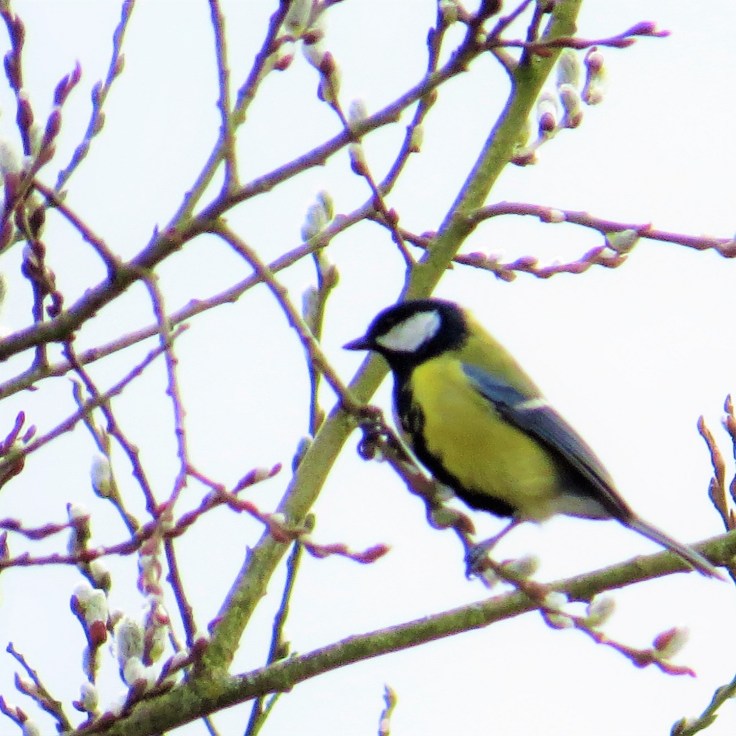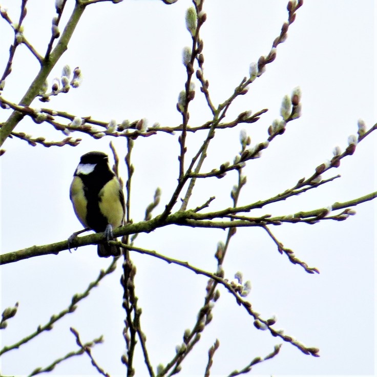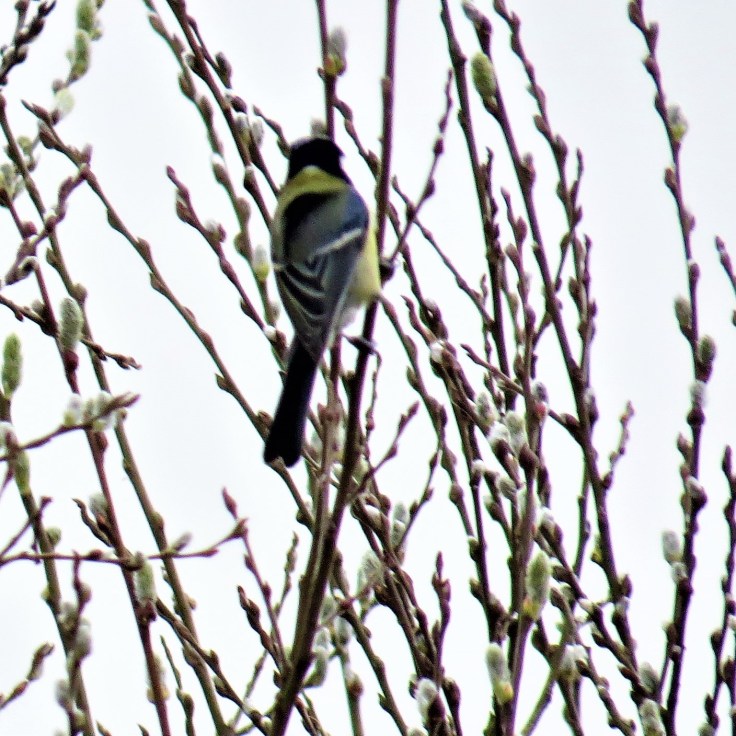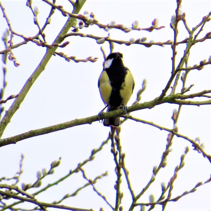 Great tits are very loud at this time of year. They sit high in the trees, like this one in the willows by the decorated bridge, and shout. It is a distinctive repetitive call like a creaky gate. Listen out for it.
