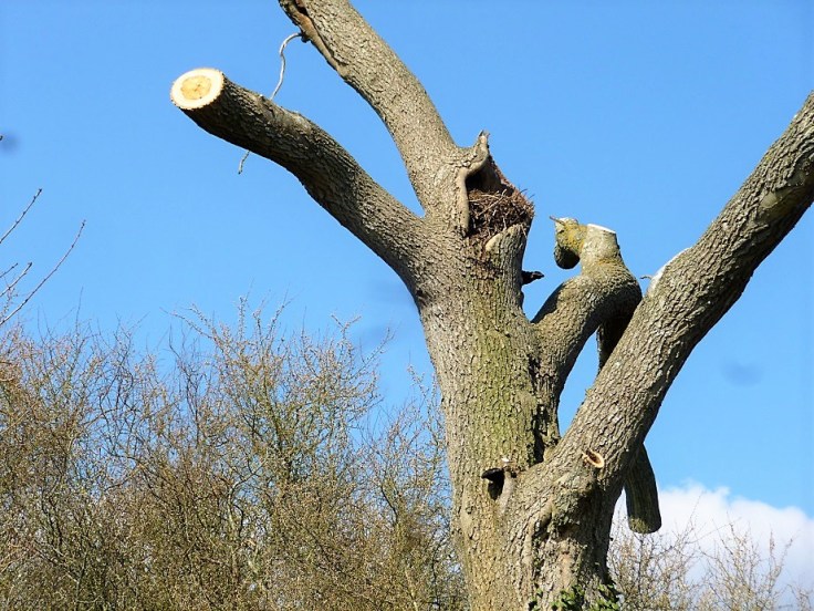 We may have disturbed the nest site to such an extent that the jackdaw and its partner will leave and nest elsewhere. Jackdaws like to nest in an enclosed space and we have opened up this space to predatory magpies and jays who might rob it if they know it is there. The severity of the pruning may boost the tree into life, though, and provide some cover.