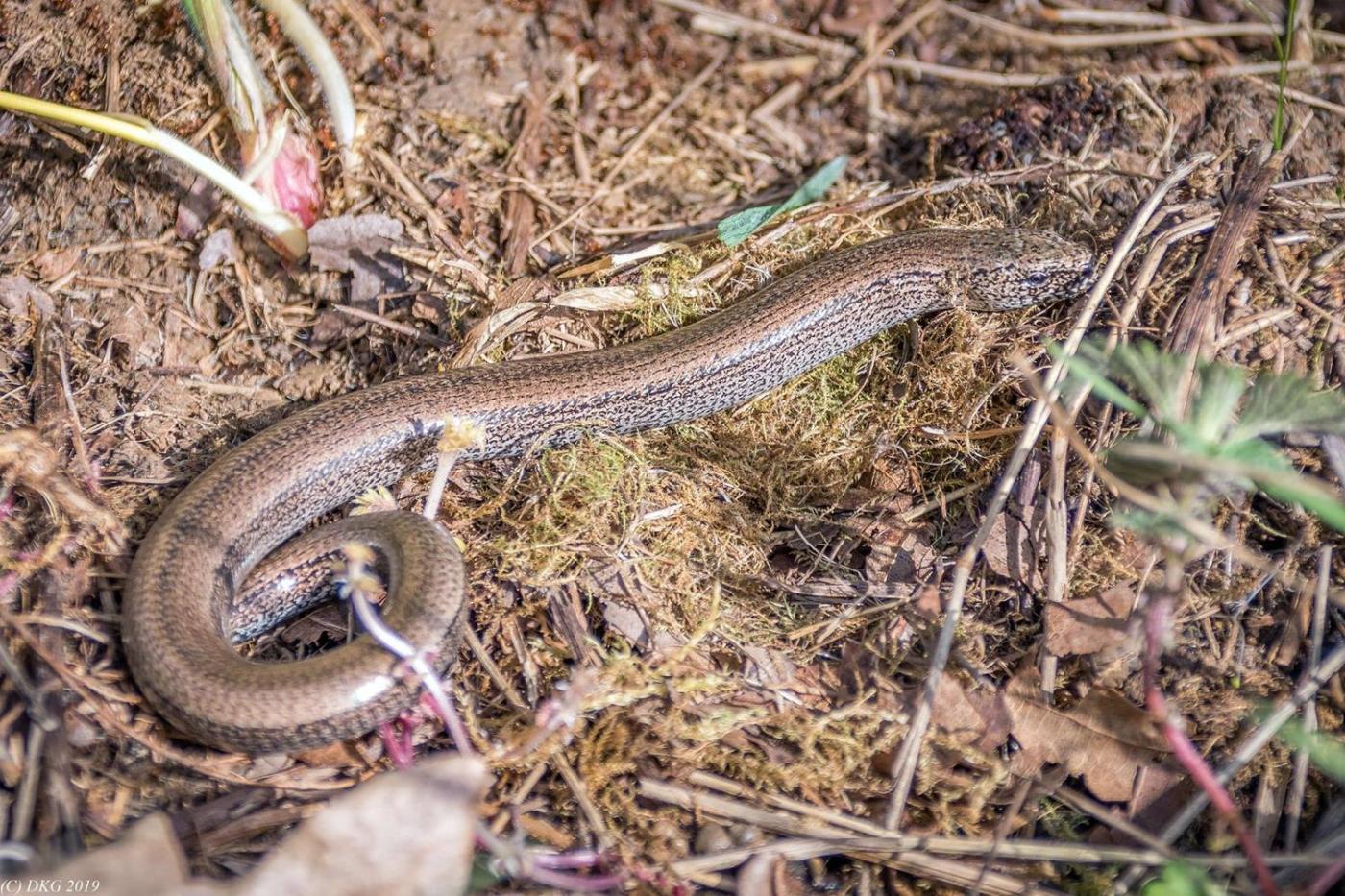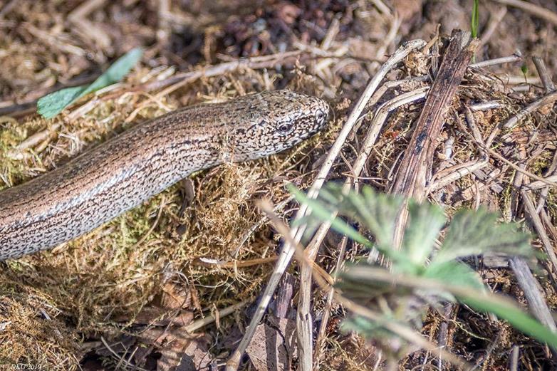 “At the end of the last work party we made our first check of the year on the slow worm mats . The small coppice in Kestrel Field, and the Arboretum were checked; not expecting to see any this early in the year, we were pleasantly surprised to find a solitary slow worm warming itself under one of the mats. This was the same mat where we found the grass snakes in 2017. Hopefully more will be found as the summer approaches.”ย