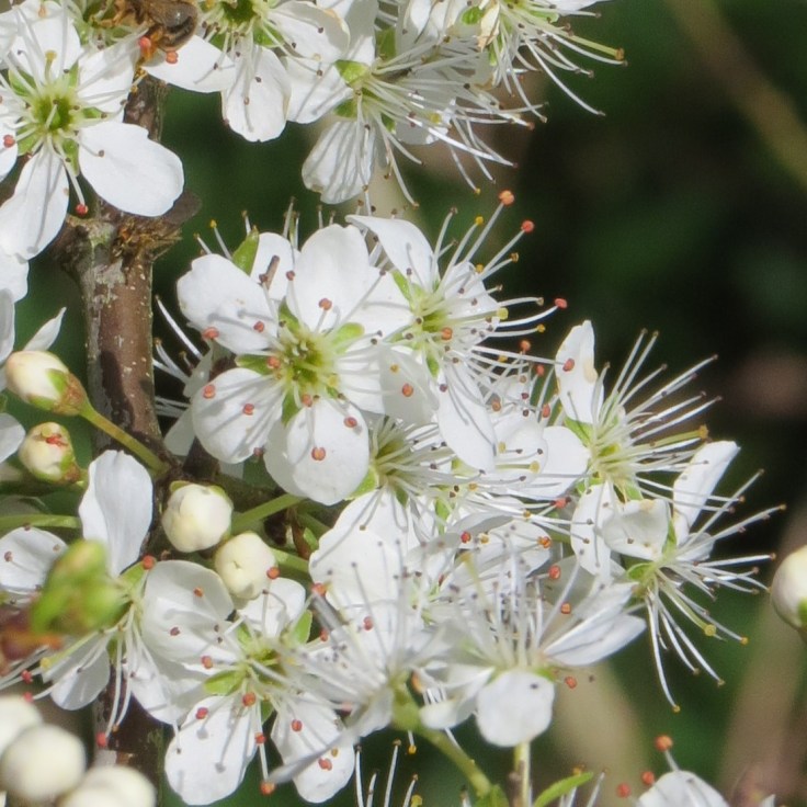 Trees have three ways of avoiding self fertilisation. Firstly, they may have their male stamens and female pistil on the same flower but ripening at different times. These are hermaphrodites. The park’s blackthorns, in flower at the moment, are hermaphrodites; they ripen their pistil first and pollinating insects foraging for nectar bring pollen from other blackthorn trees to fertilise them.