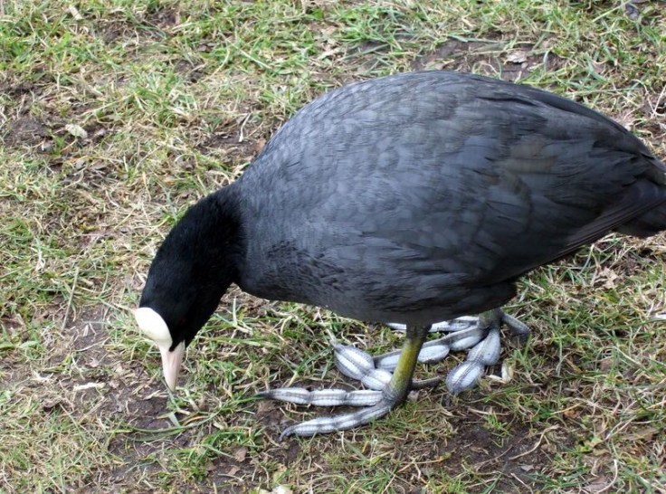 Coots have an unusually white beak and a strange white frontal shield above it. Strangest of all are its feet which aren’t webbed but have pale lobes on each side of each segment of the toes. They look as if they are wearing enormous white gloves on their feet.