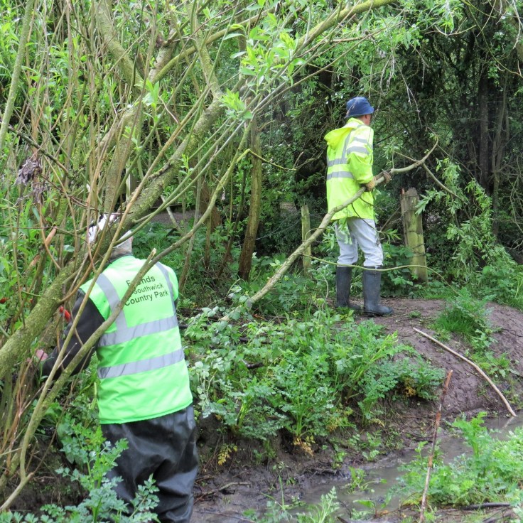 As we planned the next task, a storm arrived with a tremendous crack of thunder and we had to abandon ship By the time we had gathered the tools and the coffee cups into the back of the van, we were being pelted with hailstones while the thunder rattled the trees every few seconds and the paths turned into muddy rivers. A very sudden and dramatic ending to our morning’s work.