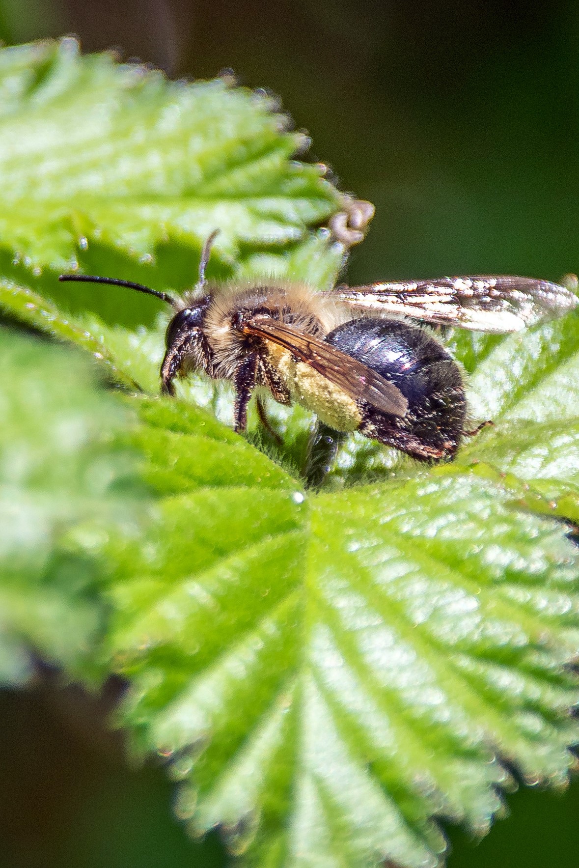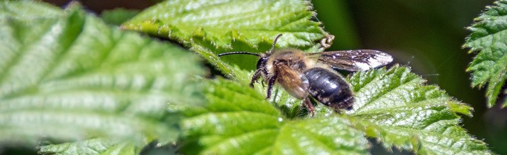 A bee on a bramble leaf, photographed by DKG on a hot May morning.