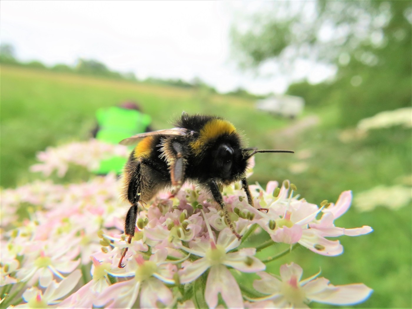 A buff tailed bumble bee collecting nectar from hogweed at Puddle Corner while, in the background, the Friends of the Park clear a fallen willow from the path.