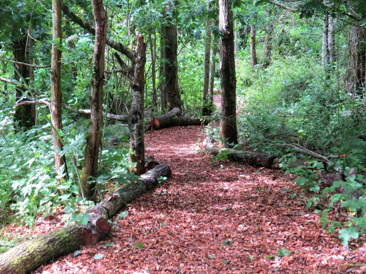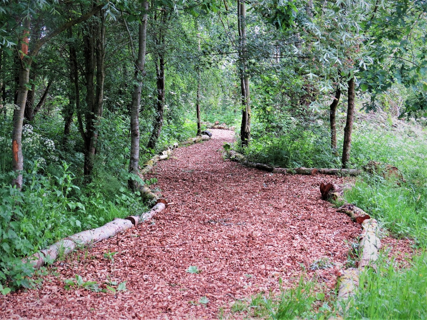 The contractors who cut down the trees near the small wooden bridge, used most of the woodchips to mark out a new path through the woods and they have used some of the logs as a border. The path leads through the trees to the small piece of set-aside in Village Green.