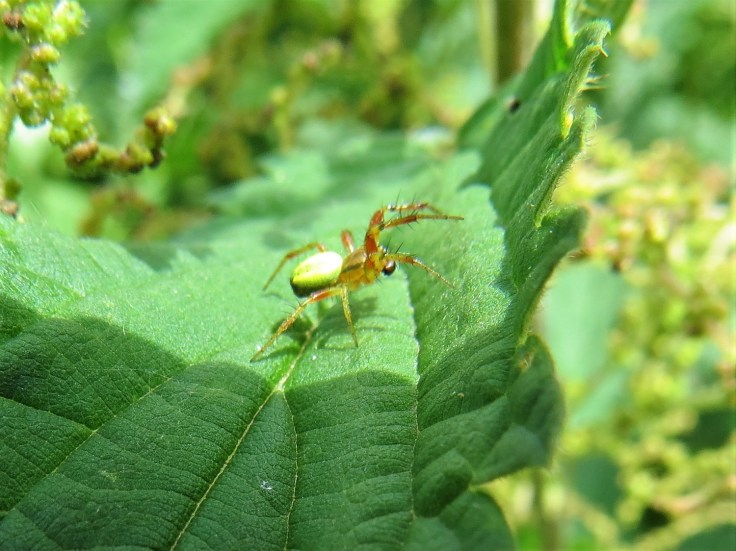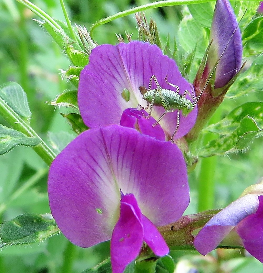 This extraordinary creature is the nymph of a speckled bush cricket (Leptophyes punctatissima). It is an inadvertent portrait: the photographer was focusing on the flowers of the common vetch and only found the bush cricket when the picture was enlarged for detail.