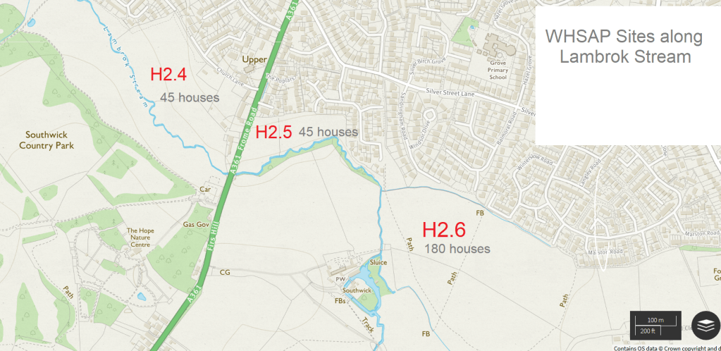 Wiltshire Council has allocated three sites (H2.4, H2.5 and H2.6 – see map) for development in the bats’ flight corridor, all three of which abut Lambrok Stream. It is proposed that a total of 270 houses be built on these three sites.