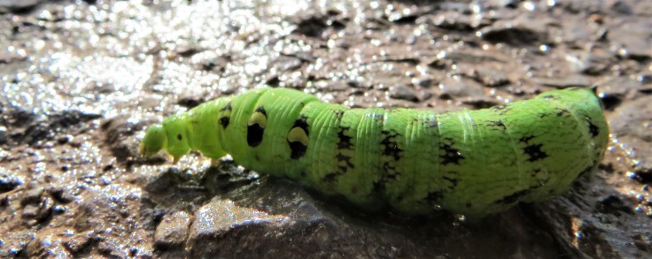 Elephant hawk moth caterpillars have four large eye spots near the head and when disturbed they contract their head back into their body which makes the eyes spots appear very large – a defence mechanism. When feeding, the head extends, appearing trunk like and thus their name.