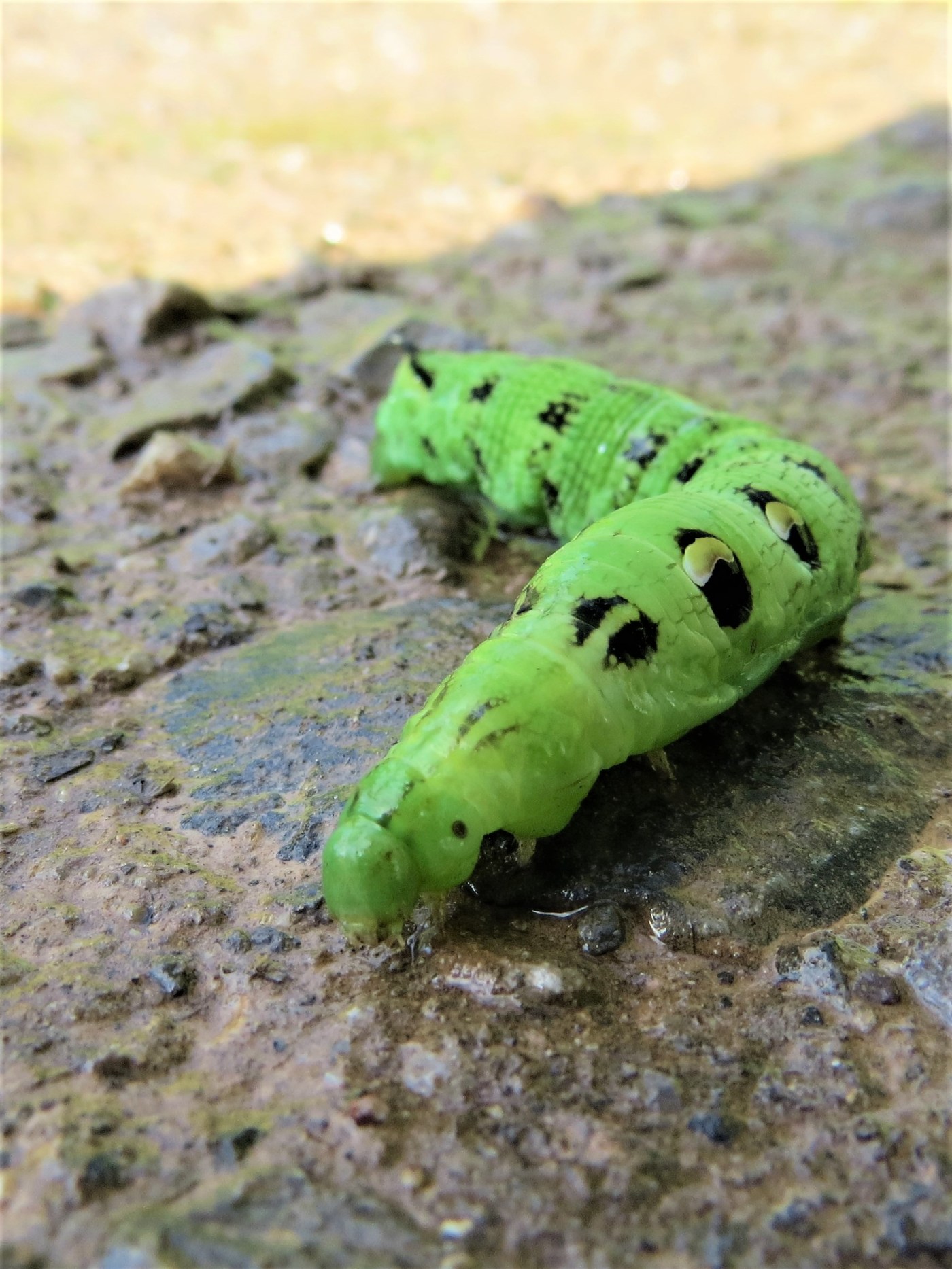 Elephant hawk moth caterpillars have four large eye spots near the head and when disturbed they contract their head back into their body which makes the eyes spots appear very large – a defence mechanism. When feeding, the head extends, appearing trunk like and thus their name.