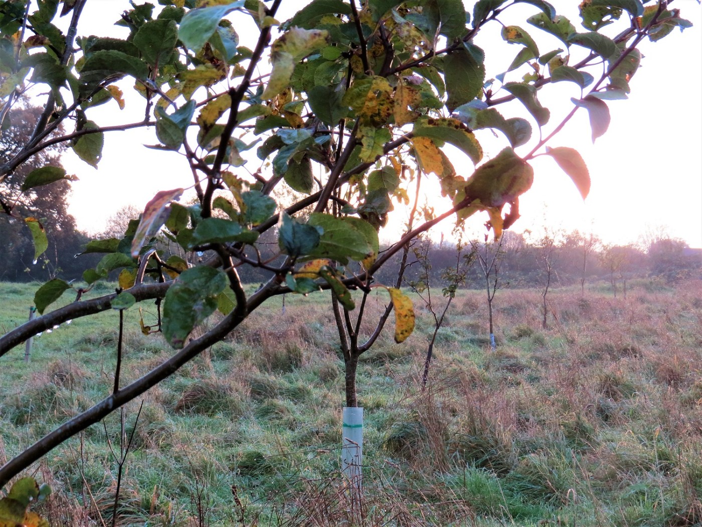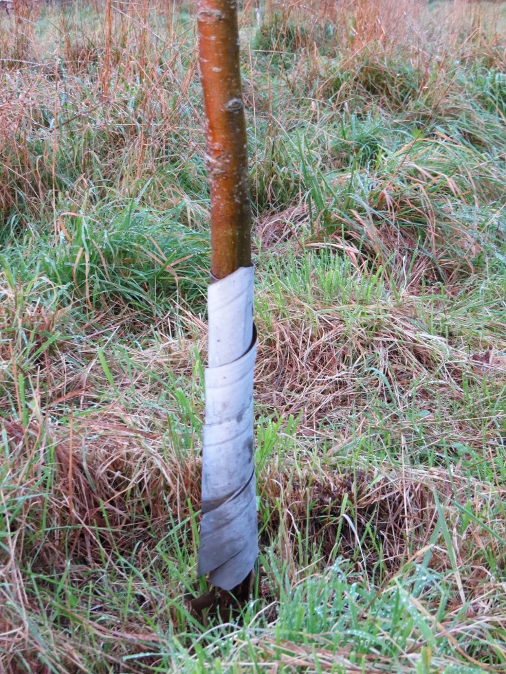David, Clive, Ian and I worked in the Community Orchard during last week’s work party. David had already done some pruning the previous week, so the task now was to clear around the trees to reduce competition from grasses, add stakes to prop up some of the leaning trees and a few tree guards to protect them from being nibbled (one of the trees we think has been favoured by small deer, or possibly used as a scratching post!)