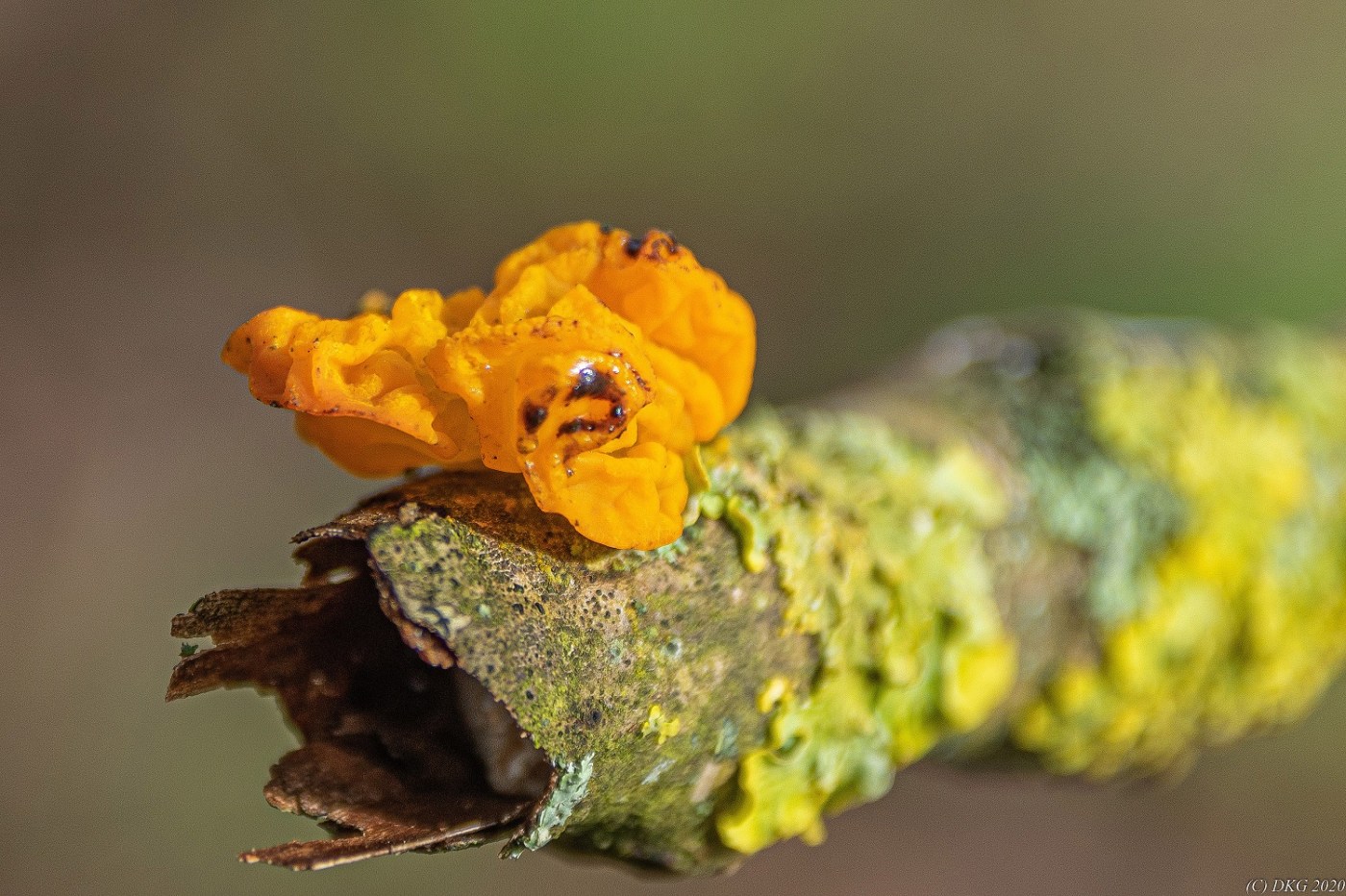 Both T. mesenterica and T. aurantia are parasitic. They grow on the hyphae of wood decay fungi, usually on dead branches that are still attached to the tree.
