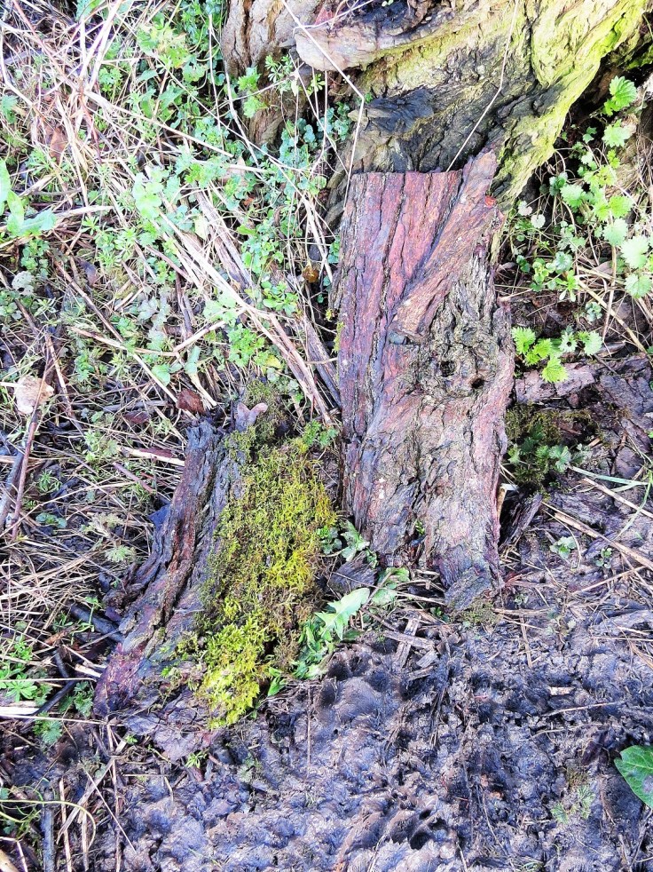 We can tell it’s not just mindless vandalism because, bar a couple of pieces left propped against the tree, the bark has been carried away. We are inclined to assume that somebody has taken it for their flower arranging class, or to decorate a shop window or a display of spring flowers. This is purposeful vandalism.