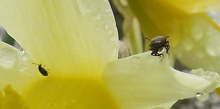 And here is an inadvertent invertebrate and his chum, caught by our candid camera, going about their various businesses among the daffs: