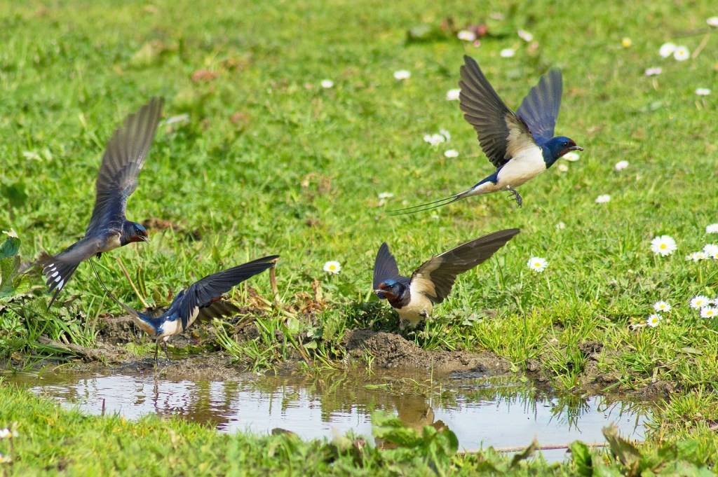 Common swallows (Hirundo rustica), returned from their long migrations, come hawking over our fields and ponds in search of insects at this time of year.