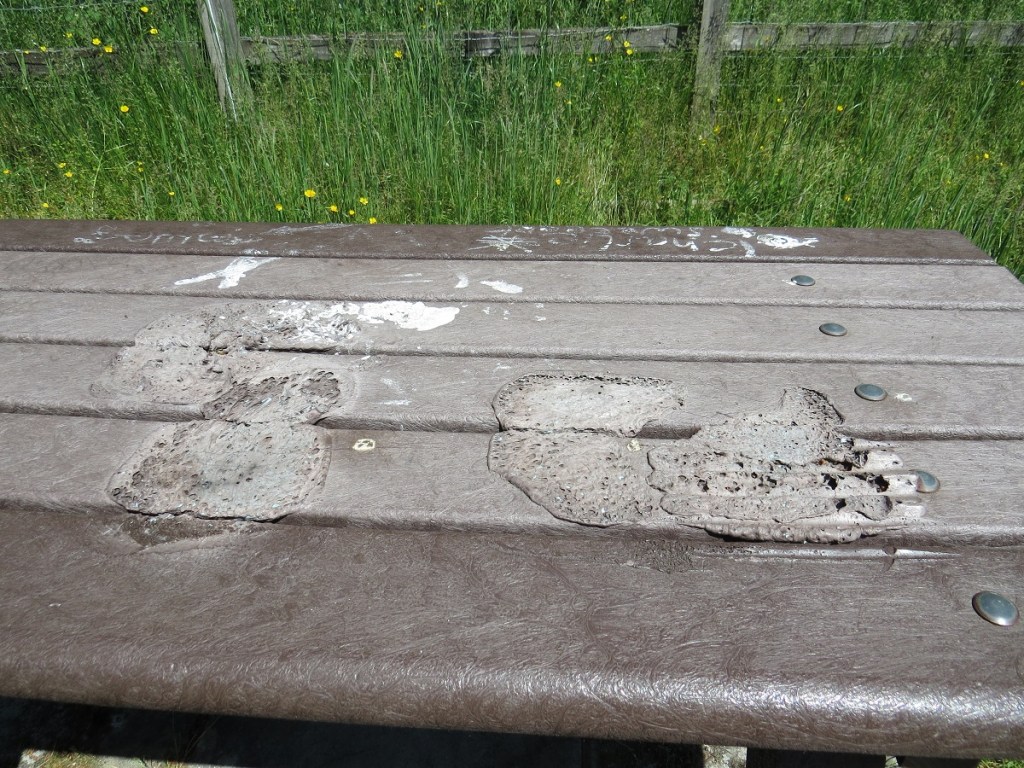 Our picnic tables, on which somebody placed their barbecue at the weekend. We hope the smell of burning plastic spoiled their dinner.