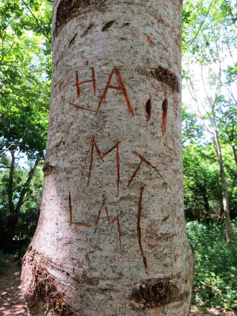 This was just mean spirited. The perpetrators were old enough to acquire and drink the many cans of cider and beer that were left around the ashes of their bonfire, yet still young enough to think it a really neat idea to carve their initials into a tree; too old now for building shelters but not old enough to understand that there would be other children coming along behind, who would need the wherewithal to build their own shelters.