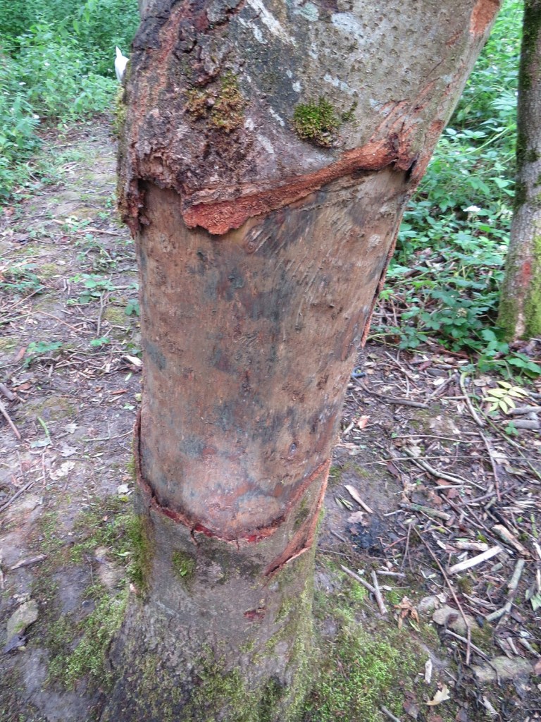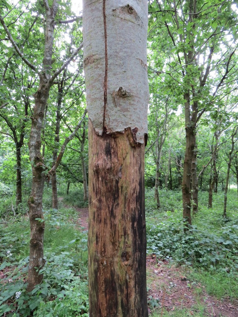 A closer look around the clearing yesterday revealed a lot more damage to the trees; the bark has been stripped from many by somebody with a knife or a chisel and several have been ring barked, something which will always kill the tree.