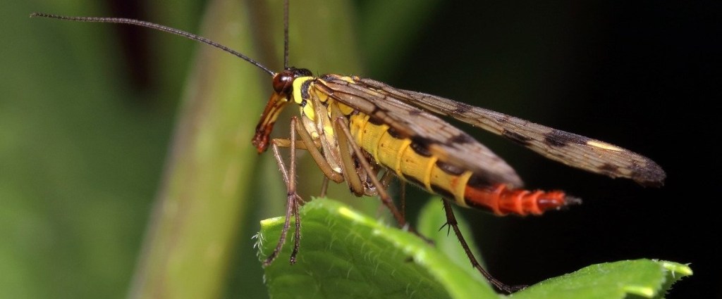 It is 10 – 15mm in size and easily recognised: black and yellow body with a reddish head and dark patches on the wing. Apart from the beak-like projection, the male’s genital area is swollen and held over its body like a scorpion’s tail – thus the common name – but the female’s abdomen is tapered to the tip.