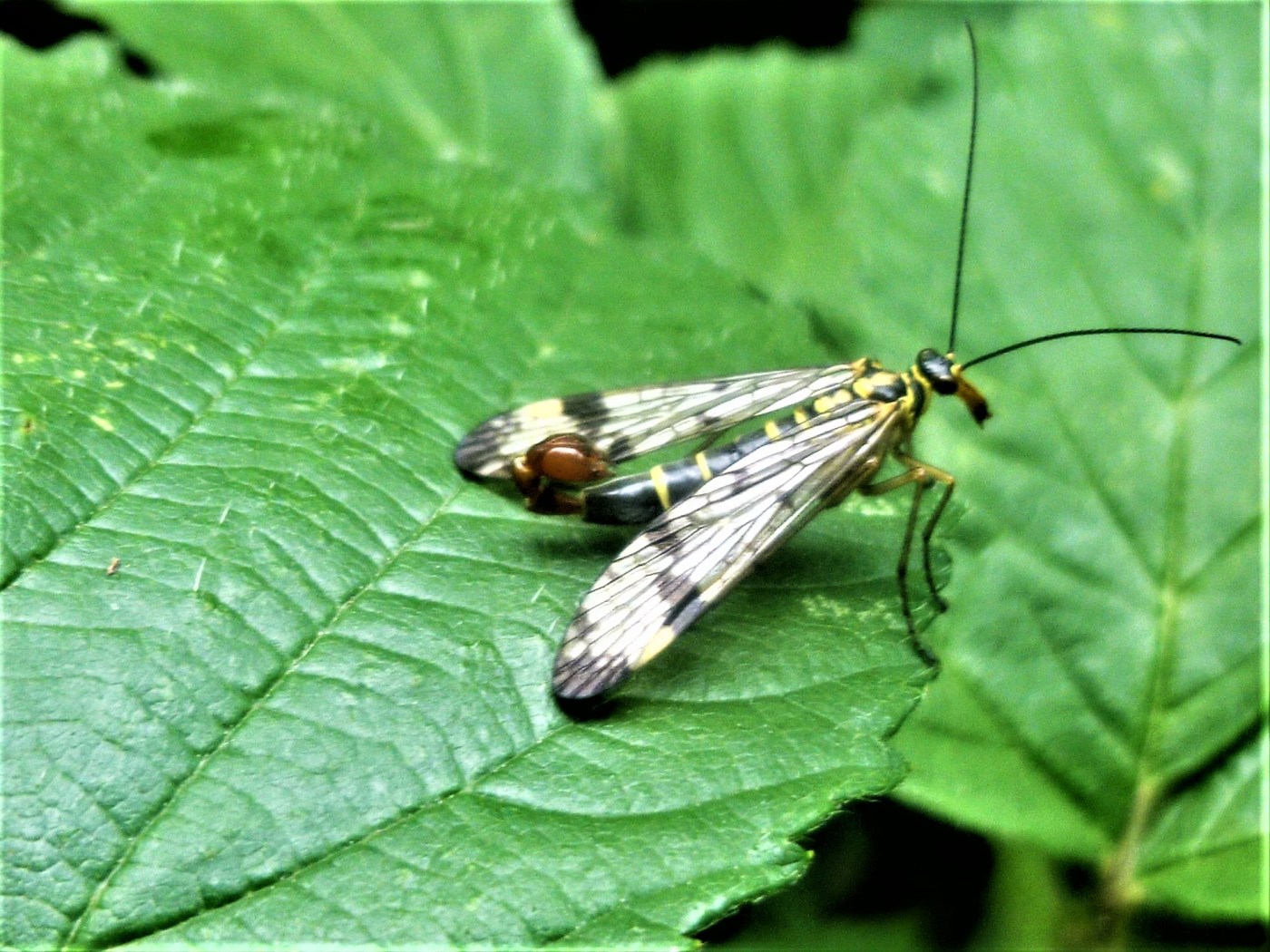 It is 10 – 15mm in size and easily recognised: black and yellow body with a reddish head and dark patches on the wing. Apart from the beak-like projection, the male’s genital area is swollen and held over its body like a scorpion’s tail – thus the common name – but the female’s abdomen is tapered to the tip.