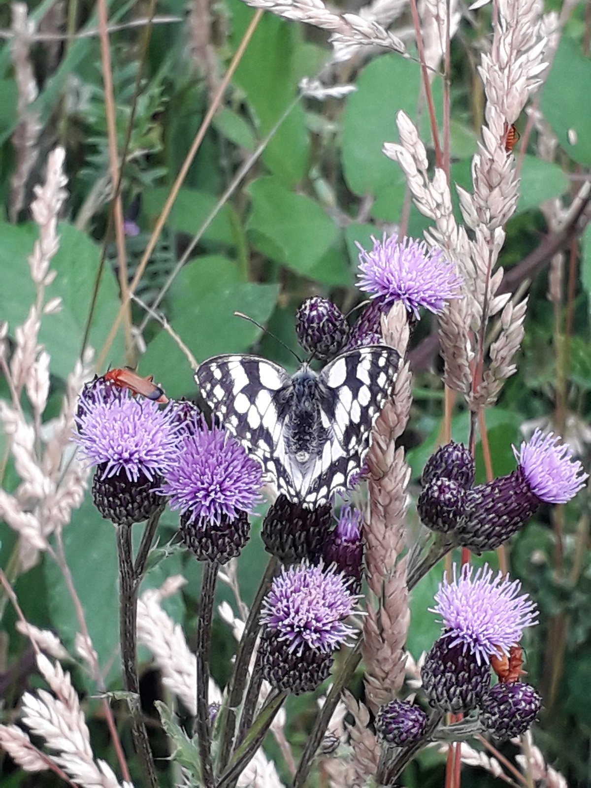 A marbled white (Melanargia galathea) on creeping thistle flowers, photographed in the park yesterday by Julie Newblé. If you look carefully, there are at least three common red soldier beetles hidden in the picture.