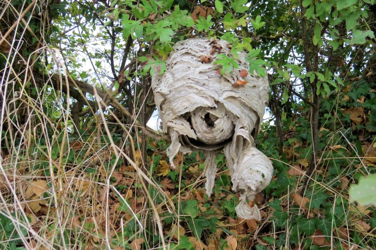 Wasps have stripped wood from the fence in the picnic area, leaving light-coloured lines on the weathered grey boards. All British social wasps make their nests out of paper and they make the paper out of wood fibres and saliva.