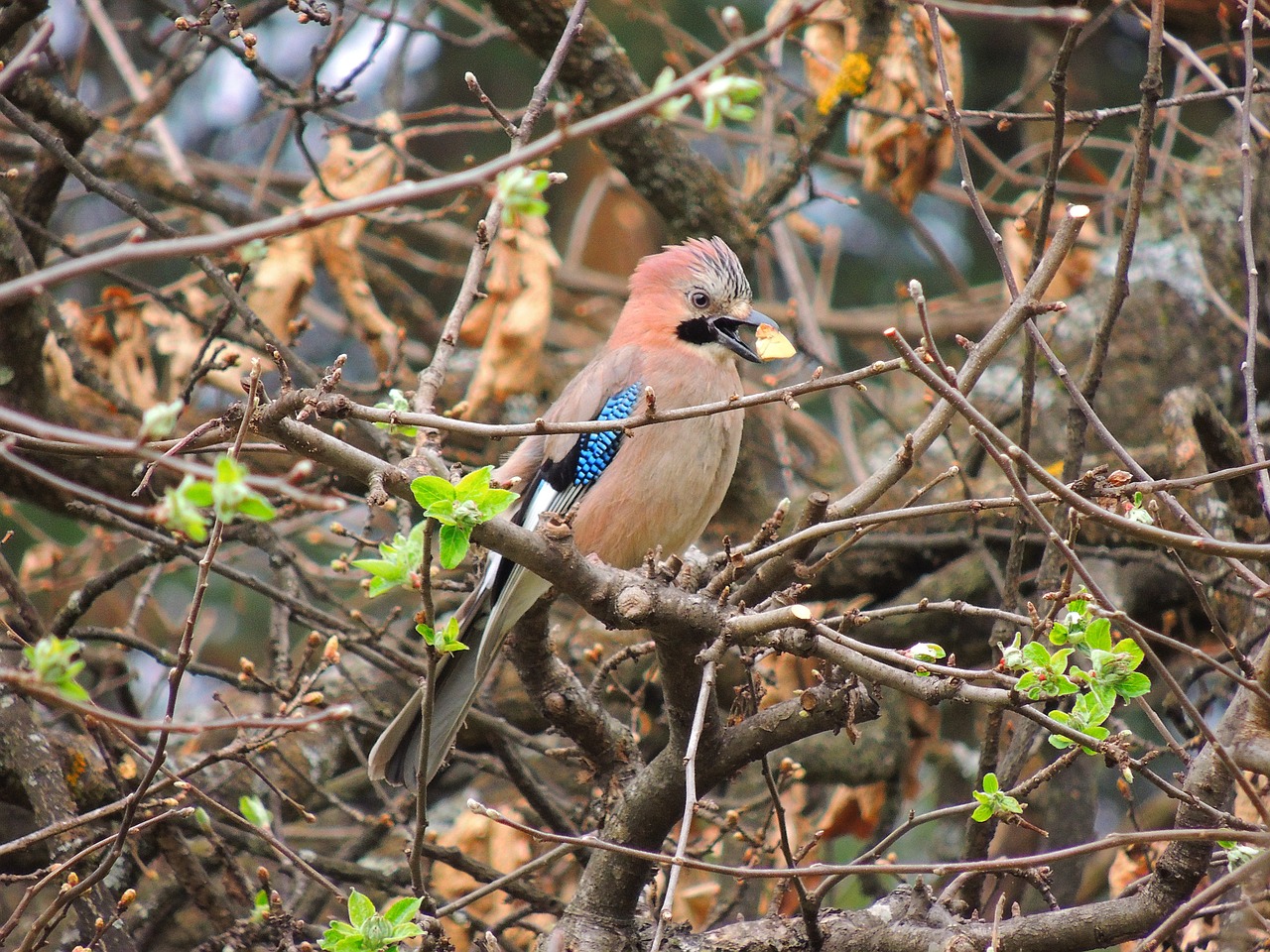 The parkโs tree cover has been increasing for some years now and it has become ideal territory for jays; lots of oaks in a mixture of woodland and meadow. Like most corvids, jays are omnivores but they are known for collecting and storing acorns for their winter diet. In the autumn they cache thousands of acorns which they carry away from the tree three or four at a time in a specially adapted gullet, and bury, sometimes individually, sometimes in batches. They seem to have a remarkable ability to remember where they put them