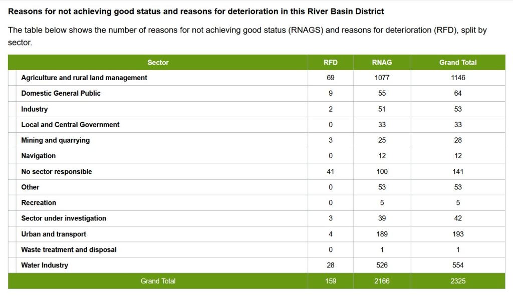 In addition, only 14% of rivers met the new standards set for ecological status. The EA classifies a waterbody’s ecological status in five stages (bad, poor, moderate, good, and high) and publishes a category called RNAGS (Reasons for Not Achieving Good Status).