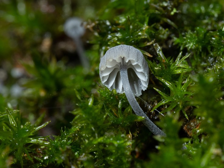 As I was marvelling at how an oak tree is more than just a tree – it is its own mini ecosystem, with mosses, lichens, insects and birds all dependent on these trees for a home and places to feed – a tiny speck of colour caught my eye. There was something that was a bluish-grey contrasting with the vibrant green of the moss. On closer inspection, I had discovered a tiny mushroom growing on the moss of this oak. When I say tiny, I am not exaggerating. This mushroom was no taller than 7mm, with a cap measuring 3 to 4mm in diameter. Its stem was probably 1mm in diameter.