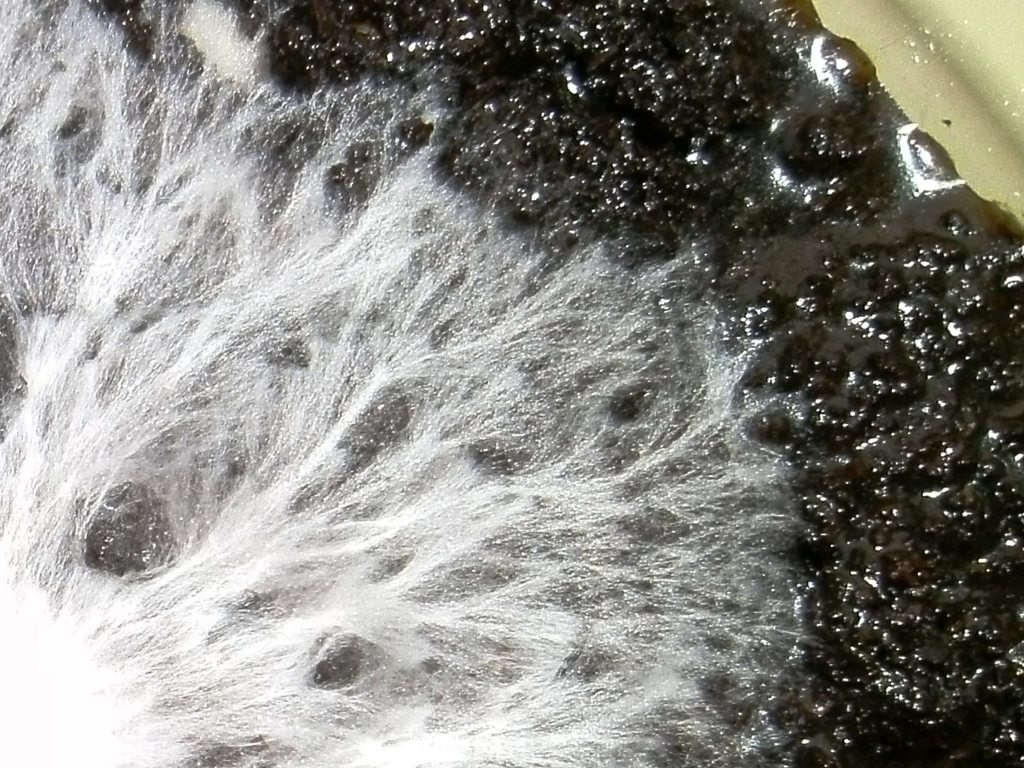 Oyster mushroom mycelium [1] showing radiating growth pattern of the hyphae and [2] the fruiting bodies of a fairy ring mushroom (Marasmius oreades).