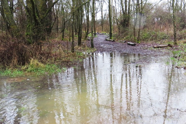 The park is full of water; there are deep puddles everywhere. Everything is wet and muddy and the paths are flooded.