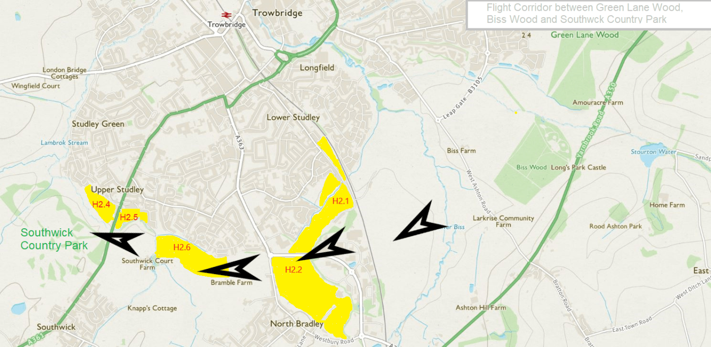 The majority of the bats roost in Green Lane Woods and Biss Wood to the east of Trowbridge. They commute to their feeding grounds in and around SCP Nature Reserve along a green corridor of undeveloped land to the south of Trowbridge. Five of the six housing sites allocated by Wiltshire Council for development in the Trowbridge area are in this important green corridor: Elm Grove Farm (H2.1), land off the A363 at White Horse Business Park (H2.2), land south of Church Lane (H2.4), land at Upper Studley (H2.5) and Southwick Court (H2.6). The header picture at the top of this post is of a map that shows how these five sites fill the bats’ flight corridor, almost entirely, from east to west.