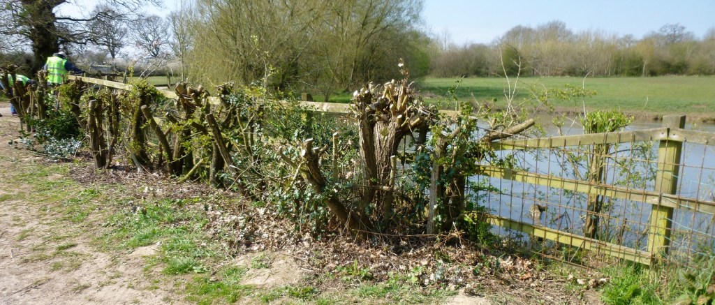 By the end of the morning the fence from the Willow at the start of the pond to the Oak at the exiting stream was in very good order. While this was going on Sarah and Joan and the rest were planting and watering in well over 50 whips of Hawthorn, Dogwood and Hazel to thicken up the somewhat decimated hedge.