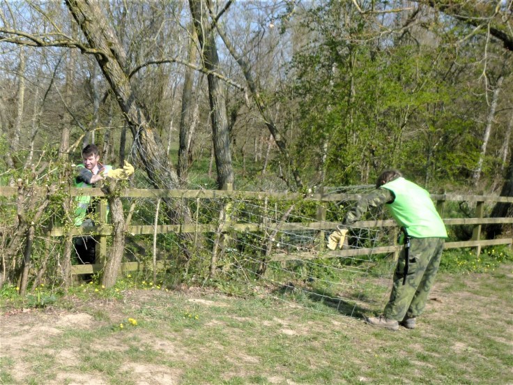 The rest of us headed for the pond. Rich had sourced some good lengths of stock fencing and Clive and Simon were soon reinforcing the inner fence line.