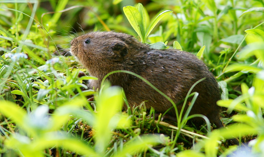 Water vole (Arvicola amphibius) and beautiful demoiselle (Calopteryx virgo)