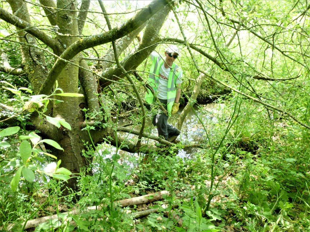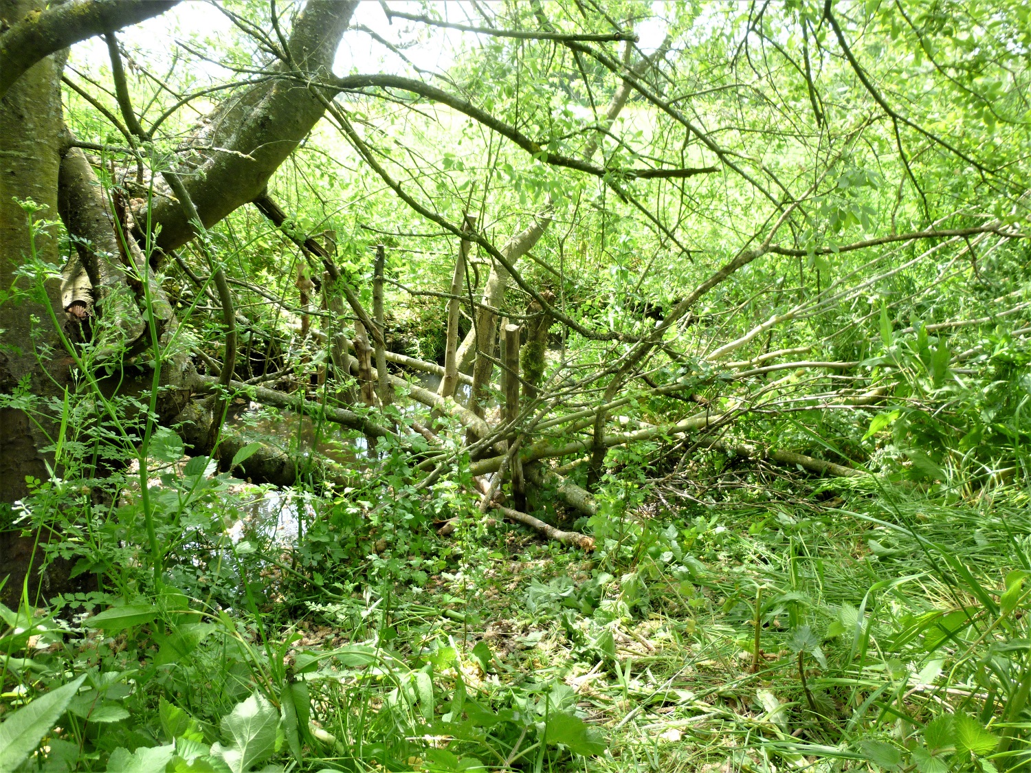 …which was to stake the Lambrok tributary between the decorated bridge and the pond to safeguard the rare and protected Water Voles that live in this stretch of the stream. We drove the Ash poles and some Willow stakes into the stream bed with gaps wide enough for the voles to get through but not wide enough for the occasional dog to plunge along the full length of the stream.