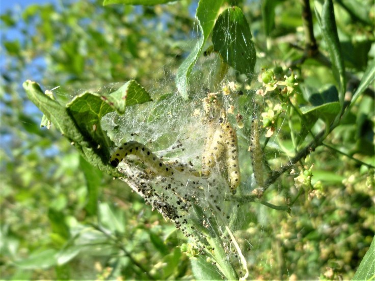 As a plan, we know it’s working. Among the species we planted was spindle (Euonymus europaeus) and last weekend, for the first time, Ian identified spindle ermine moth caterpillars (Yponomeuta cagnagella) in several sites in our hedges.
