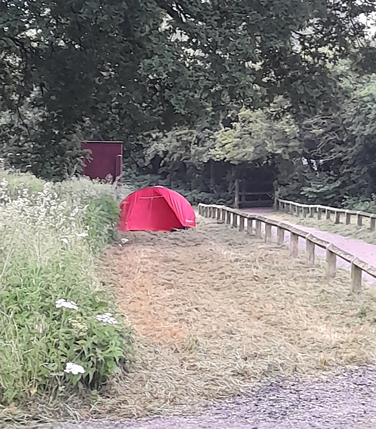 One of our early-risers has sent us a picture of a small red tent pitched just inside the main entrance, right next to the noticeboard on which the NO CAMPING sign is displayed. It may or may not contain the person/people who lit a fire in the picnic place last night.