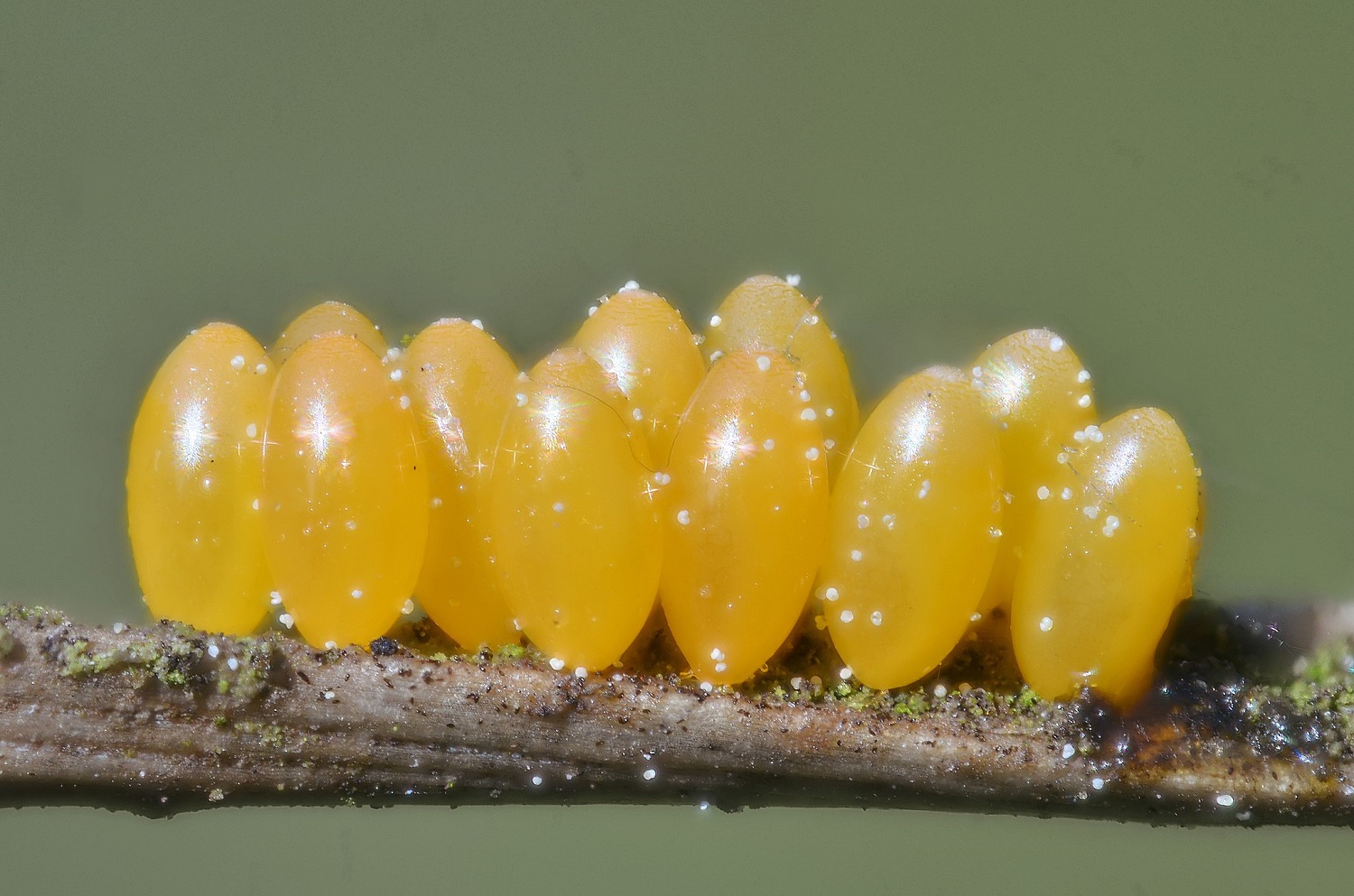 [1] Multi-coloured harlequin ladybirds hibernating inside the reserve’s noticeboard. Harlequin ladybird eggs [2], pupa [3]