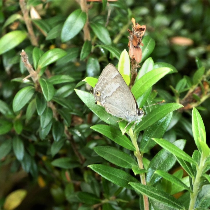 “Definitely a rather worn Purple Hairstreak. Usually common where oaks occur but very elusive, staying round the tops of the trees and rarely flying until early evening. A few occasionally come down to lower levels to feed from flowers.”