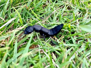 [1] Sarah’s blurred picture of a fast-moving Devil’s coach horse; [2] Devil’s coach horse larva.