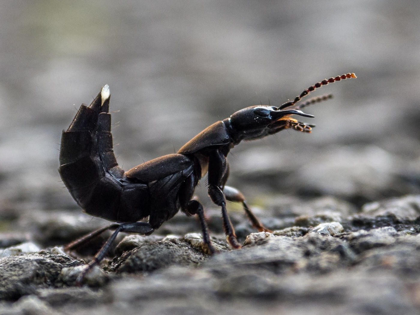 If it feels threatened, a Devil’s coach horse will adopt this aggressive, scorpion-like position with raised rear end and open jaws. If the threat persists, it squirts a foul-smelling fluid from its abdomen. But beware: a Devil’s coach horse can also give a painful bite with its strong pincer-like jaws.