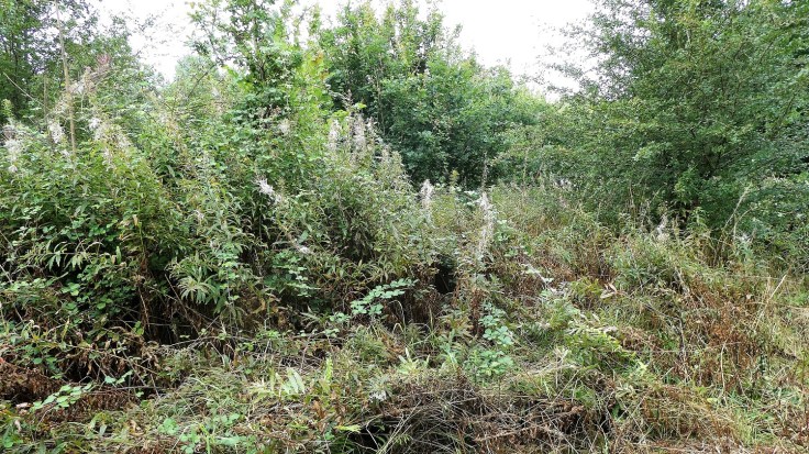 [1] Brambles, young Hawthorn, Blackthorn, Ash and Willow Herb [2] Young Redwoods.